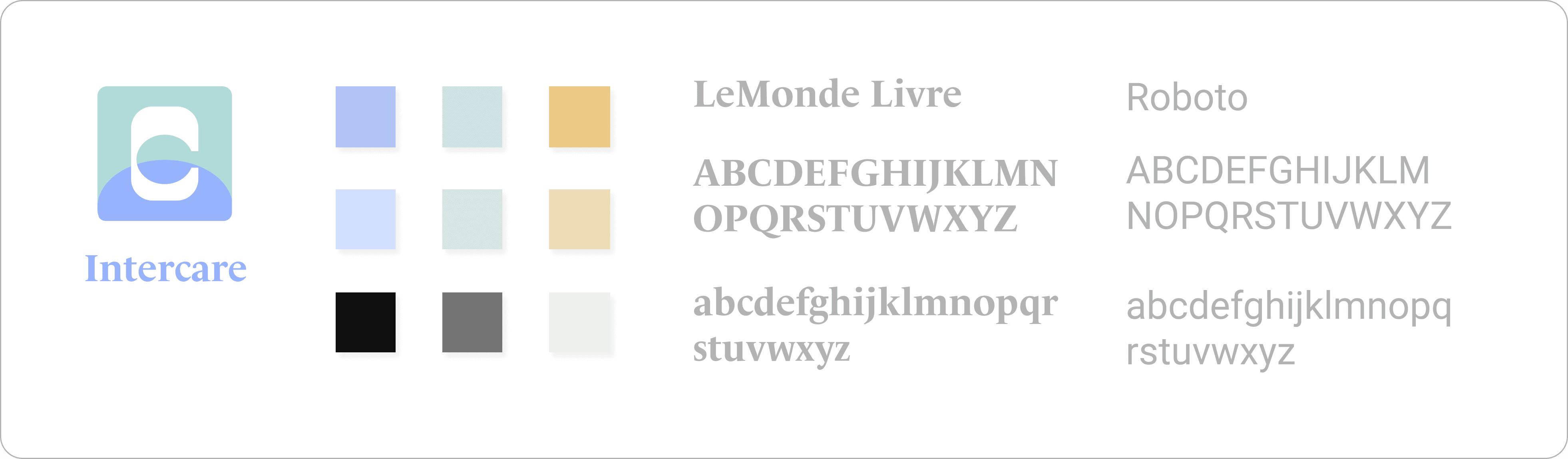 The branding of Intercare is calm and neutral but with pops of color that the user can customize and therefore feel in control of their experience. I chose Lemonde Livre and Rooto, as itβs simple, easygoing, and readable. Also, I made sure all font sizes were reasonably accessible.