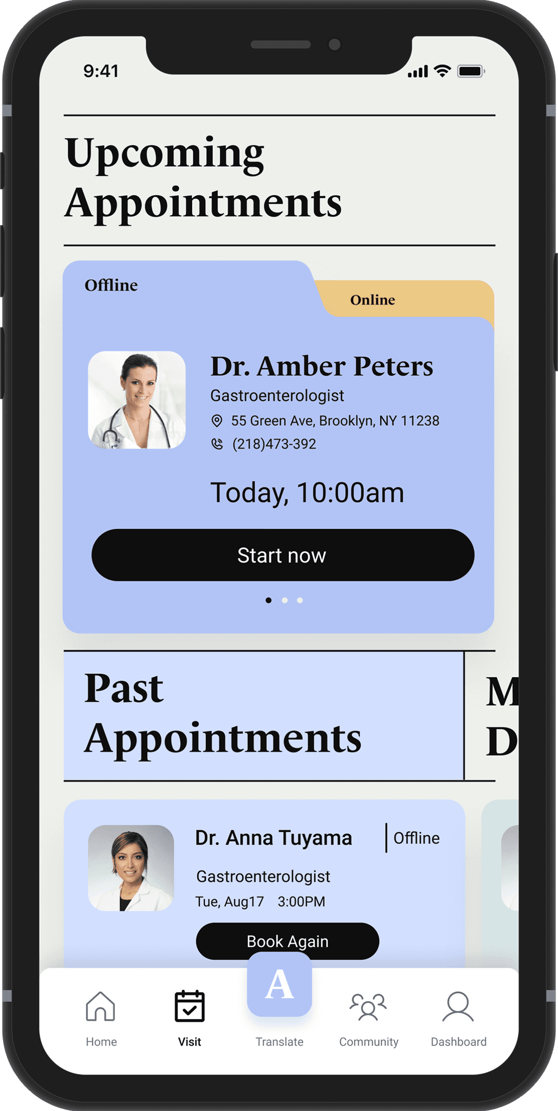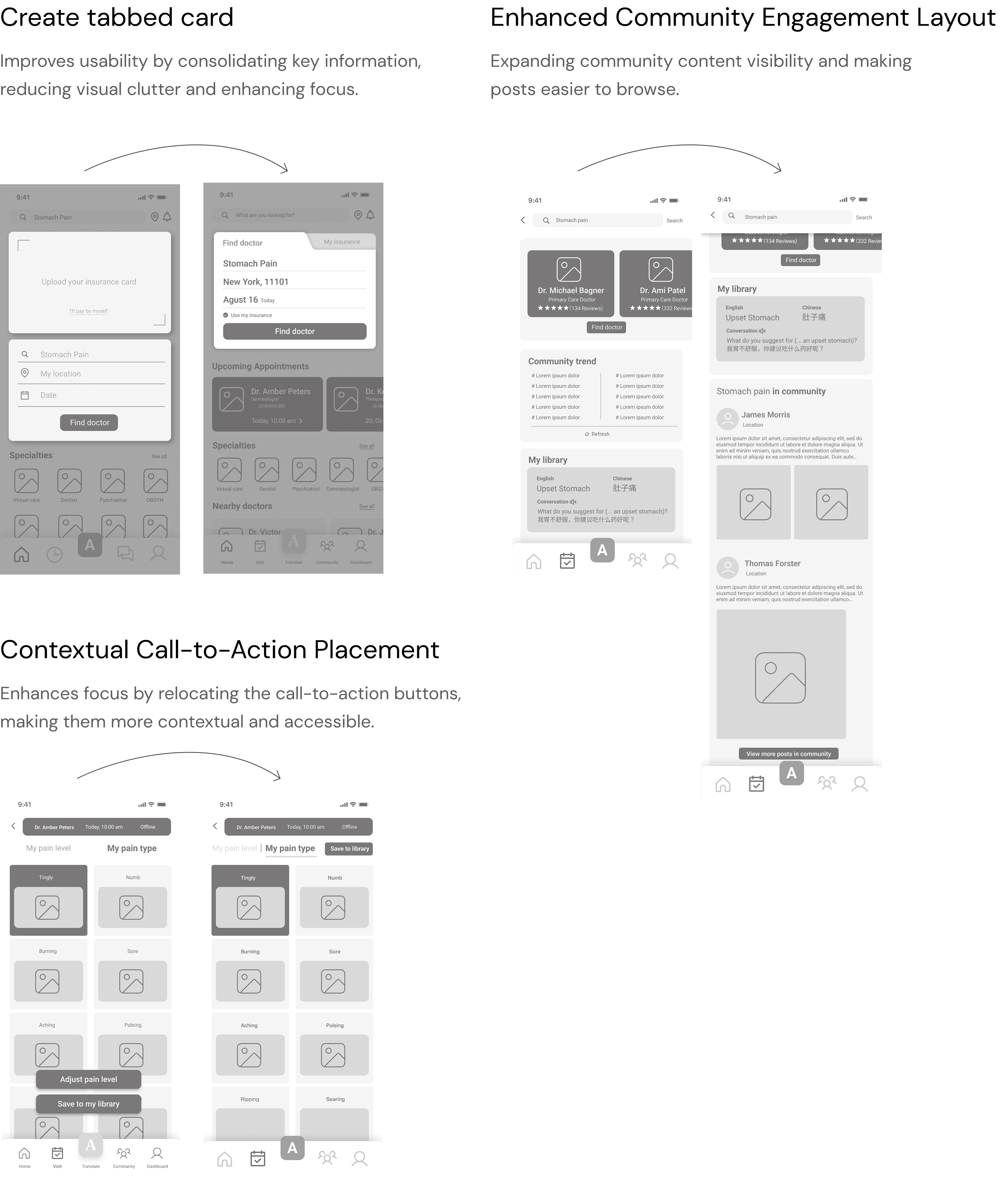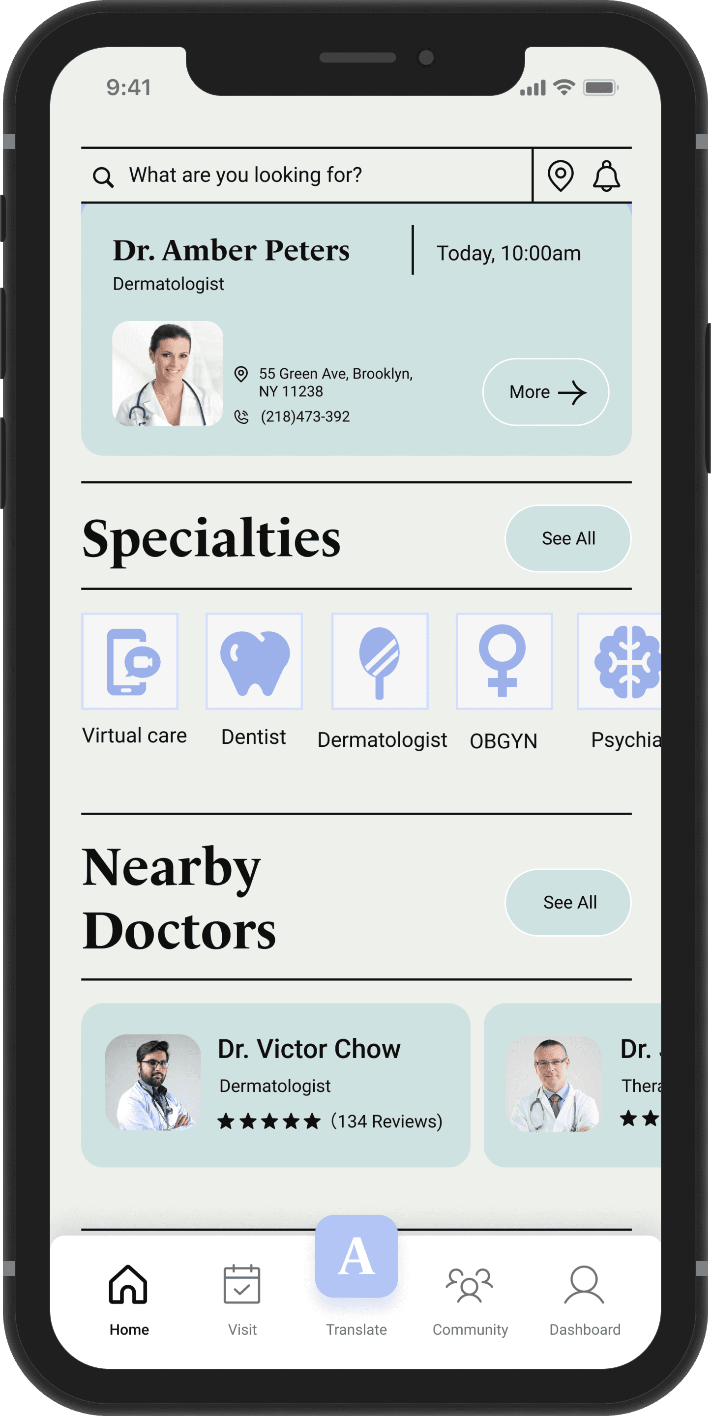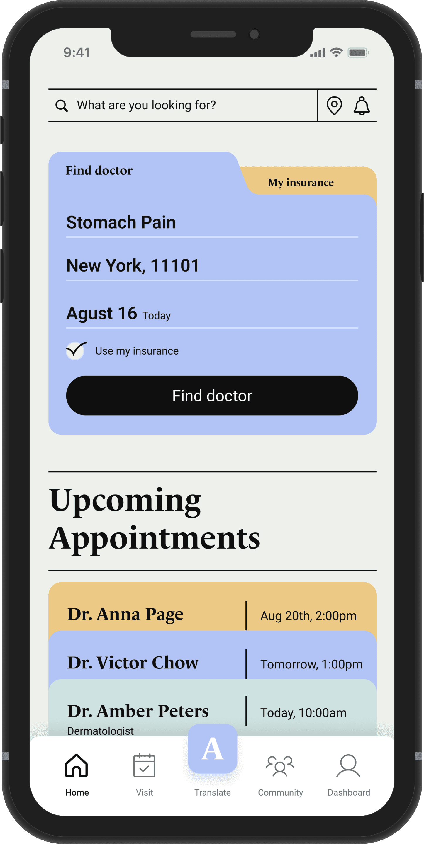 Users can find doctors, upload insurance, check upcoming appointments, check all specialties, nearby doctors and book again with doctors on the Home Page.