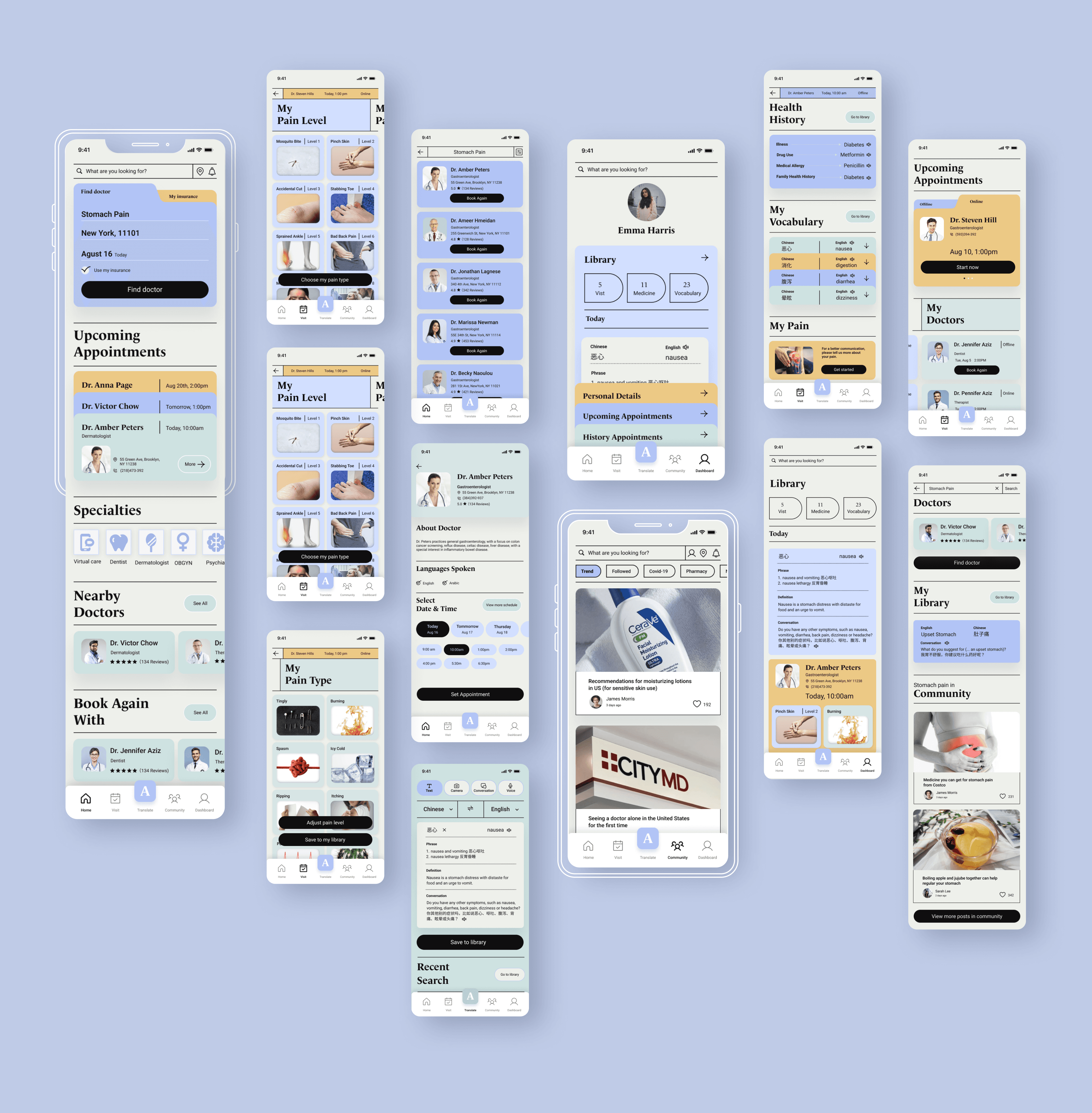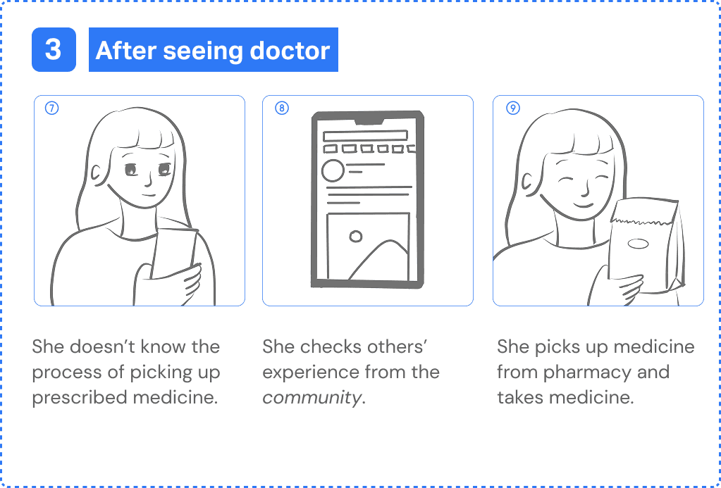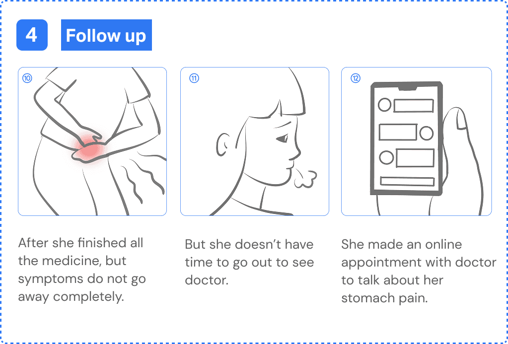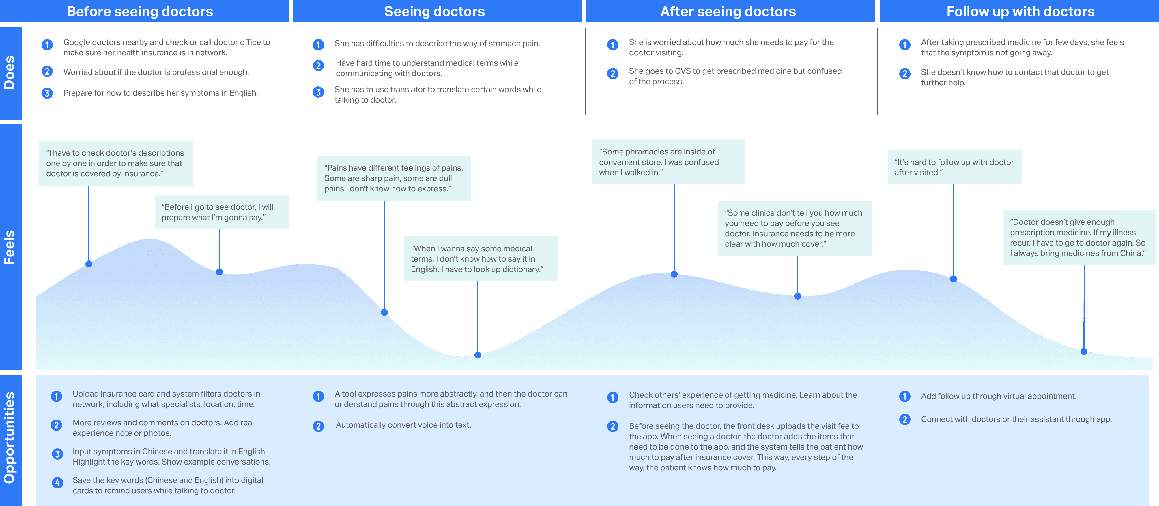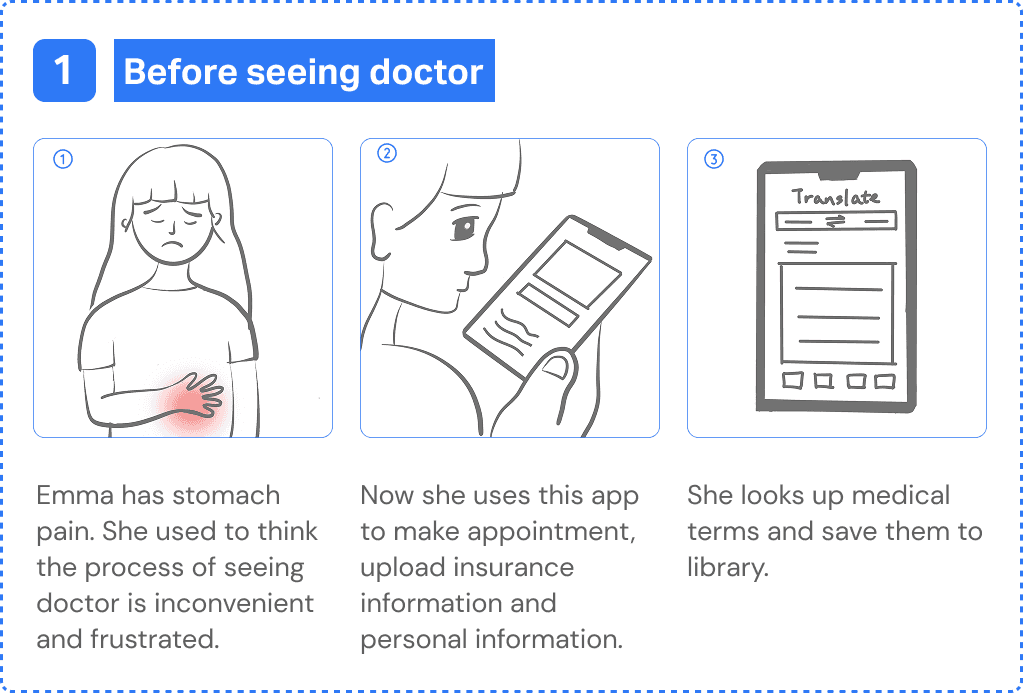 Emma is an international student from China studying in New York. She isnβt familiar with the U.S. medical system. After struggling with a headache for a week, she decides to see a doctor. However, it's difficult for her to find a nearby doctor covered by her health insurance. She also faces challenges communicating her symptoms. As a result, she often feels unconfident and frustrated throughout the medical visit process.