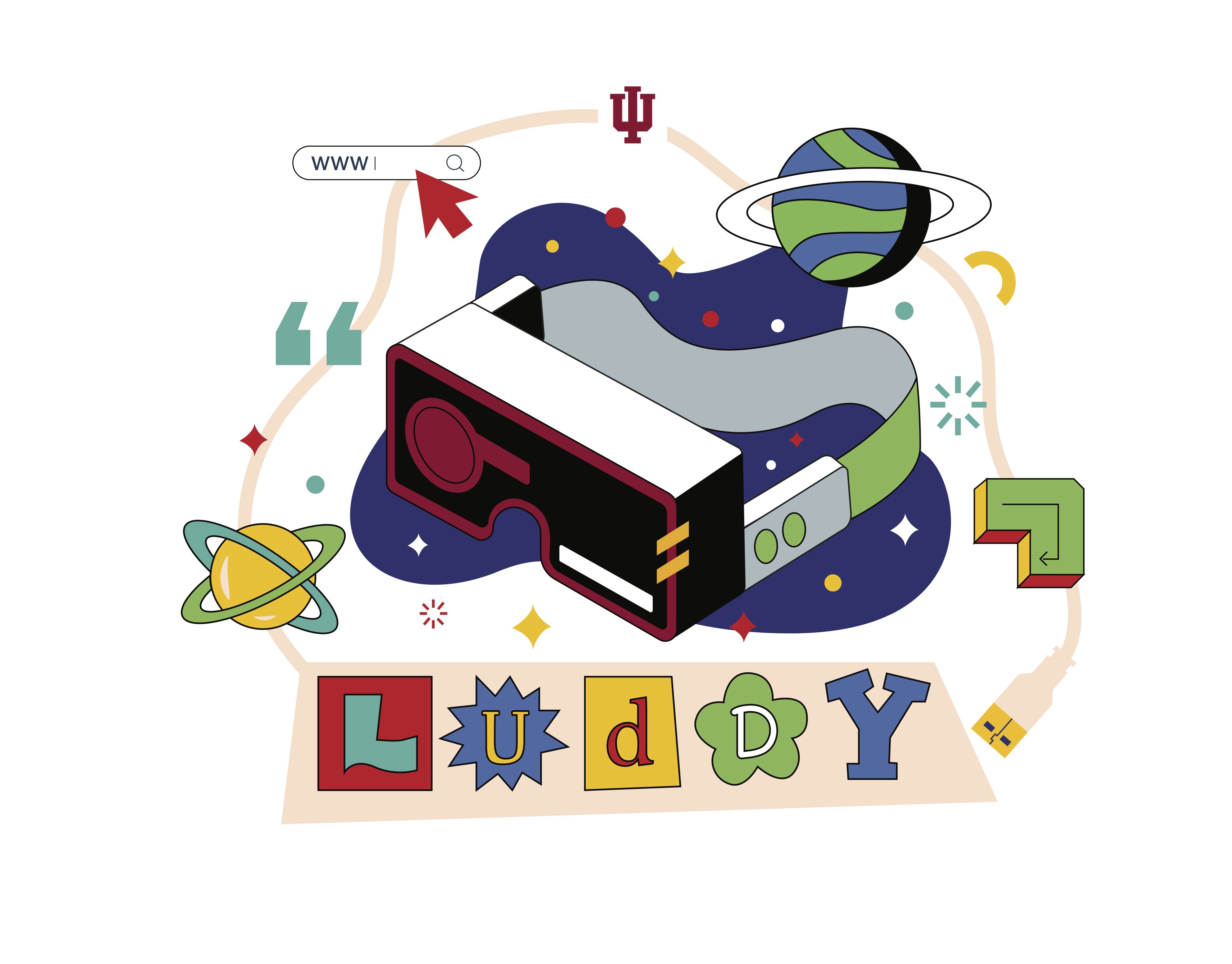 This T-shirt illustration celebrates Luddy’s mix of technology, creativity, and exploration. I combined a VR headset, planetary elements, UI fragments, and modular letterforms to express how students navigate digital and physical worlds at Luddy.