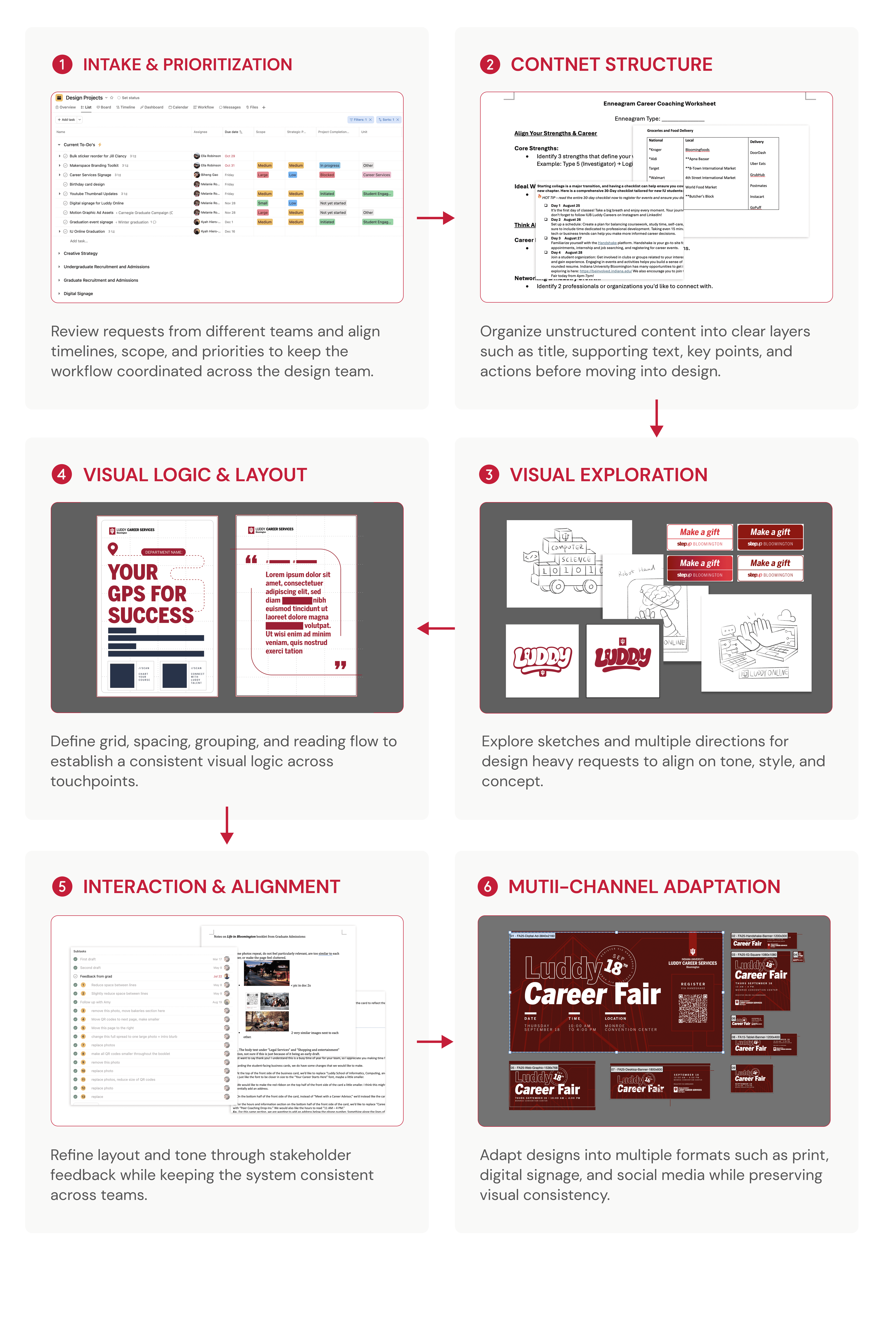 Transforming complex internal requests into clear, consistent, and student-centered visual communication across 15 campus touchpoints.